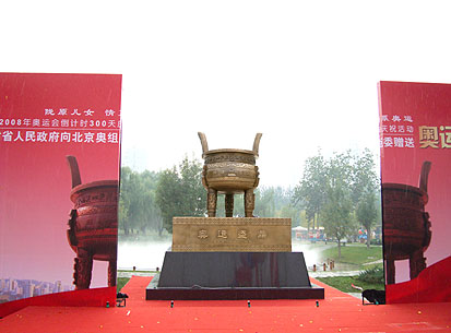 2007年10月13日,北京奧運會倒計時300天,北京朝陽公園里彩旗飄飄,彩球高懸,到處洋溢著歡慶的氣氛。上午10時,由國家文化產(chǎn)業(yè)示范基地山西宇達集團精心鑄造、甘肅省人民政府贈送給北京奧組委的青銅《奧運盛鼎》在這里舉行隆重的捐贈揭幕儀式。著名歌唱家郭蓉的一曲《紅旗飄飄》把整個活動推向高潮。北京奧組委執(zhí)行副主席蔣效愚,甘肅省副省長馮健身以及300名大學生奧運志愿者和千余名熱心中外觀眾參加了揭幕慶典。北京奧組委執(zhí)行副主席蔣效愚在致辭中說,《奧運盛鼎》的捐贈活動有益于彰顯中華民族燦爛文化,弘揚奧林匹克精神,展示中國改革開放、國泰民安的良好形象,表達了全國各族人民關心、支持北京奧運會的美好心愿。《奧運盛鼎》將臨時安放在朝陽公園西門內的霧泉廣場,奧運會開幕前將遷至奧林匹克中心區(qū),成為區(qū)中的獨特景觀。中央電視臺等各大媒體紛紛報道……巍巍青銅重器,見證著中華百年奧運夢圓,也見證著華夏兒女對百年奧運的熱切期盼。這一堪稱經(jīng)典的2008奧運會主題青銅禮器震撼著人們的心。