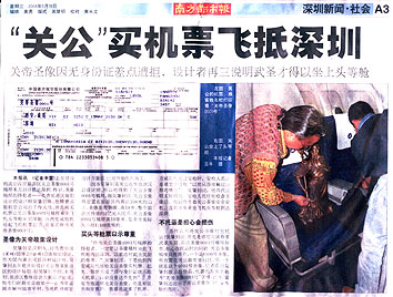本報訊(記者豐雪) 由山西宇達集團公司設計制作并推出的關公圣像第0001號本月15日抵達深圳。昨日,來自深圳的吳肇釗先生稱,他特意說服航空公司的工作人員,開先河買機票讓關公圣像0001號乘坐飛機頭等艙來到深圳。由西安咸陽機場起飛的機票顯示,旅客名稱為關帝圣像0001號。