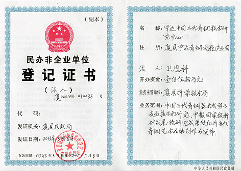 宇達(dá)中國(guó)古代青銅技術(shù)研究中心登記證書