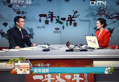 ??? 2013年2月9日除夕,國家文化產(chǎn)業(yè)示范基地山西宇達(dá)集團(tuán)創(chuàng)意設(shè)計制作的高端青銅"蛇"系列藝術(shù)禮品再次被中央電視臺春晚節(jié)目組選中,其中《金蛇狂舞》和《常如意》兩款還被請上中央電視臺除夕特別節(jié)目"一年又一年"的直播臺,讓億萬觀眾再次感受作為中國文化特有符號之一的生肖蛇的獨特魅力。這是繼2011年農(nóng)歷兔年以來,宇達(dá)高端青銅藝術(shù)生肖禮品第三次亮相央視春晚。