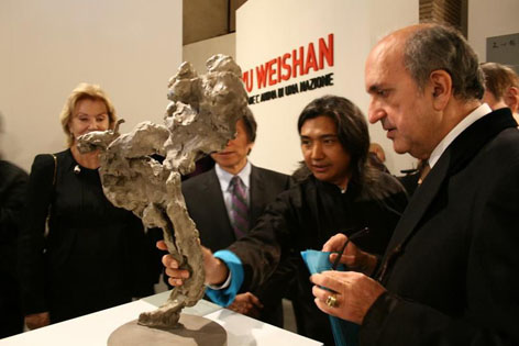 參觀結(jié)束前,賈慶林主席久久地緊握吳為山的手說:"你作為人民政協(xié)委員,作為藝術(shù)家,為祖國贏得榮譽,為政協(xié)爭光,你在聯(lián)合國總部舉的展覽,很好的宣傳了中國文化。又在文藝復興的圣地意大利舉辦展覽。意大利是具有悠久藝術(shù)傳統(tǒng)的國家,你的作品受到了國際社會的高度評價,應感謝你!""文心鑄魂-吳為山雕塑藝術(shù)國際巡展,意大利羅馬威尼斯宮展"由中國和意大利兩國文部及中國駐意大利大使館主辦。是中國藝術(shù)家個展首次進入具有五百多年歷史的藝術(shù)圣殿,展覽以對話的文化理念展開了與文化巨匠,現(xiàn)實生活,民族同胞的對話。雕塑藝術(shù)以寫實,寫意相融匯的手法,富于歷史性,現(xiàn)實性!藝術(shù)性和思想性。正如十一月二十三日在展覽開幕式上意大利總統(tǒng)辦公廳主任迪多先生致辭中所說,中國是人類文明古國,它正在進行著意大利曾經(jīng)經(jīng)歷過的文藝復興。中國的文藝復興根源于儒家思想以及其它哲學和藝術(shù)傳統(tǒng)。吳為山的作品可以說是一連接過去現(xiàn)在和未來的橋梁,代表了中國現(xiàn)代藝術(shù)的發(fā)展,其中飽含著傳統(tǒng)與創(chuàng)新。從他的藝術(shù)可以感受到人類前進的步伐。意大利國家文物局長在致辭中說,吳先生的藝術(shù)令人震撼!完全可與意大利現(xiàn)代史上偉大的雕塑家曼祖,賈戈梅蒂比肩!我們看到了中國經(jīng)濟發(fā)展后,藝術(shù)發(fā)展的狀況。