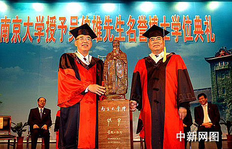 2009年5月31日上午,在南京大學(xué)禮堂內(nèi)隆重舉行授予國民黨黨主席吳伯雄先生法學(xué)名譽(yù)博士學(xué)位典禮。南京大學(xué)向吳伯雄先生贈送了珍貴的禮物——《孔子像》,雕像由南京大學(xué)美術(shù)研究院院長、中國雕塑院院長、英國皇家雕塑家協(xié)會成員吳為山教授創(chuàng)作。亦是旨在弘揚我們共同的文化,促進(jìn)兩岸增進(jìn)共識,增強(qiáng)民族凝聚力。 | |