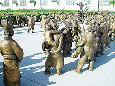 《蹴鞠之光》是為了紀(jì)念足球運(yùn)動(dòng)起源于中國(guó)山東淄博,由淄博雕塑家車(chē)秀申特意創(chuàng)作的紀(jì)念雕塑。群雕由宇達(dá)集團(tuán)制做,2007年8月5日至13日在北京中華世紀(jì)壇展出,引起轟動(dòng),不少于十萬(wàn)觀眾參觀了這組群雕,人民日?qǐng)?bào)、中央電視臺(tái)等三十余家媒體進(jìn)行了報(bào)道,該群雕總長(zhǎng)24米,寬3米,全景展示了蹴鞠運(yùn)動(dòng)鼎盛時(shí)期的宋代這項(xiàng)運(yùn)動(dòng)真實(shí)場(chǎng)景和千姿百態(tài)的市井生活,群雕共有人物324人,一千多件風(fēng)俗裝飾景觀,由少年蹴鞠、對(duì)抗、白打(無(wú)球門(mén)的散踢方式,也叫技巧賽),通過(guò)絲綢之路傳入外國(guó)等部分組成。 | |