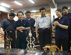 2004年6月7日,全國政協(xié)主席賈慶林、副主席王忠禹在北京韓美林工作室專程參觀了宇達(dá)制作的青銅雕塑和青銅禮品,并聽取了衛(wèi)恩科總經(jīng)理長達(dá)三個小時的宇達(dá)青銅雕塑和青銅禮品的詳細(xì)介紹。賈慶林主席對宇達(dá)的青銅雕塑和青銅禮品給予高度評價,并對衛(wèi)總提出,希望宇達(dá)能進(jìn)一步拓展中國的青銅旅游商品市場的殷切希望。 | |